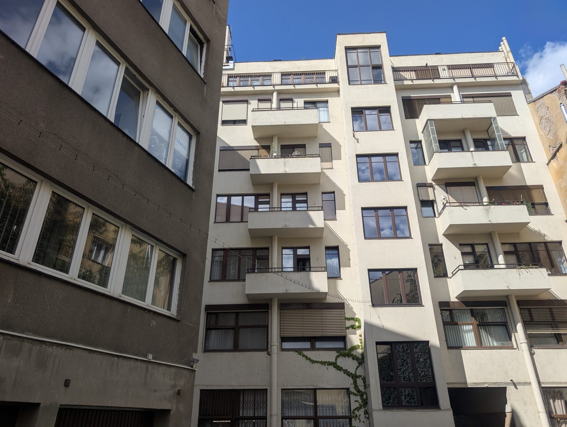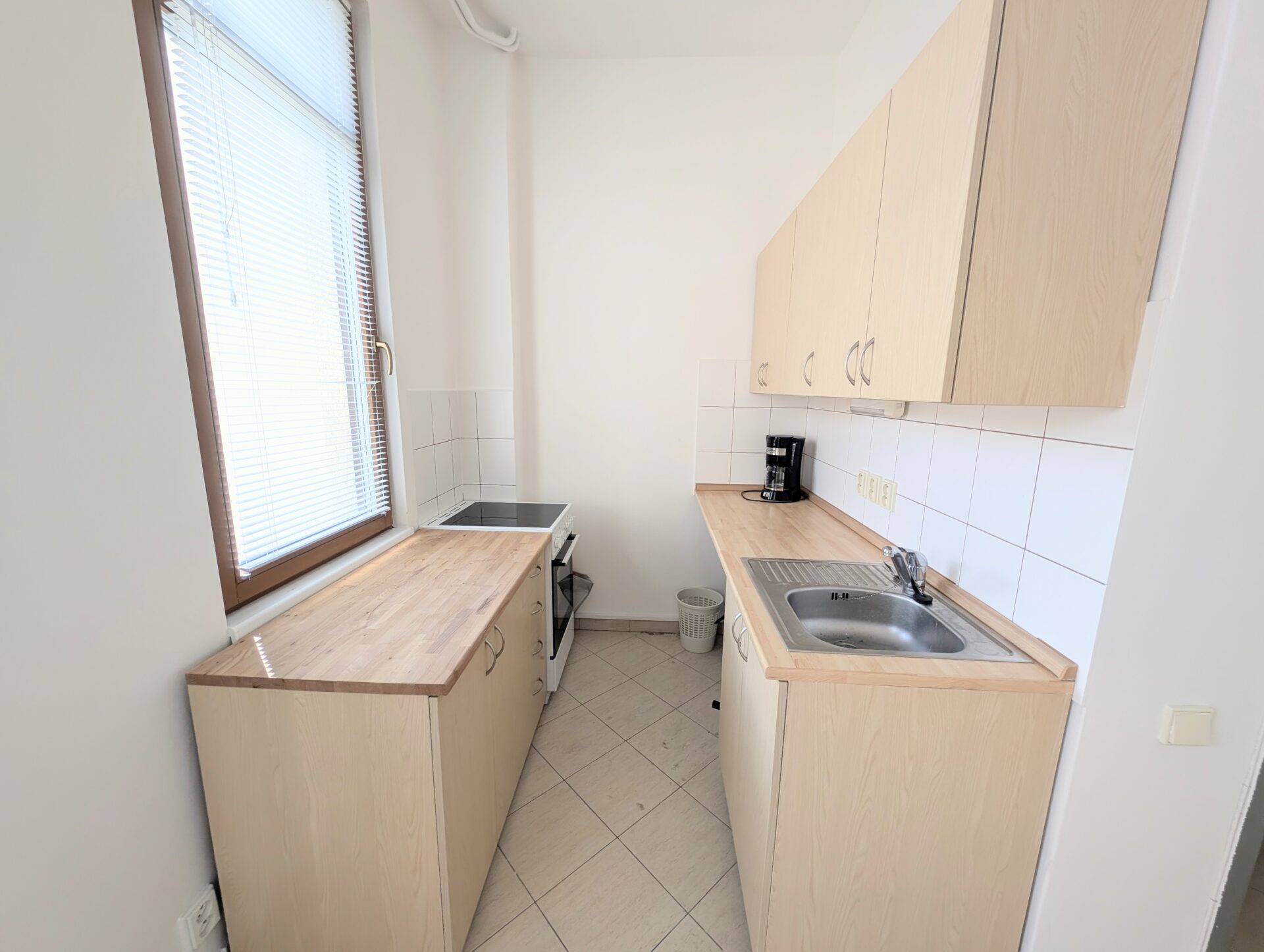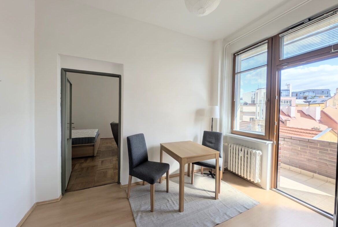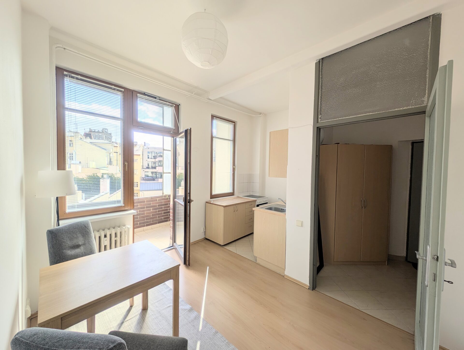 Nabízíme k pronájmu světlý byt 1+1 o ploše 42 m² s balkonem o ploše 5 m² orientovaný do klidného dvorního traktu funkcionalistického domu v centru Prahy v Jungmannově ulici. Kuchyně je průchozí, dispozice bytu je patrná z přiloženého 3D plánku. Okna obou pokojů i balkon jsou na východ. Byt se nachází ve 4.p s výtahem. Byt je ve velmi dobrém stavu, před několika lety prošel rekonstrukcí a je vybavený jednoduchou kuchyňskou linkou se sporákem se sklokeramickou varnou deskou a elektrickou troubou. Myčka, lednice ani pračka nejsou a nebudou součástí pronájmu, pro budoucího nájemce je v kuchyňské lince příprava na instalaci myčky i pračky. V koupelně je sprchový kout umyvadlo a WC.